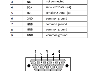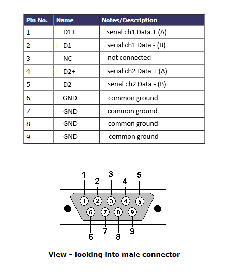 The channel 1 signals are on pins 1 and 2, while the channel 2 signals are on pins 4 and 5. The pins 6 to 9 are GND and are connected to the computer GND. The twisted pair cable screen or shield (if any) should be connected the converter GND (pins 6 - 9) and also can be connected to the GND of devices (temperature controllers). Usually the devices have an isolated power supply so that any ground loops are avoided.