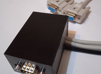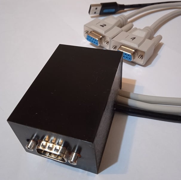The converter need to be installed close to the computer case, being connecter to the RS232 ports through 2 short cables (channel 1 and 2). The USB cable only provide the 5V supply for the converter circuits. The embedded DE-9 male connector expose the RS485 signals for both channels. The entire circuit board with the cables are encapsulated in silicone rubber for enhanced mechanical and environmental protection. Two integrated transceivers handle the RS485 signals, the RTS line is used to switch between the transmission and reception mode, this is controlled by the Windows serial driver. This serial driver will take up to 15 ms to disable the transmitter and enable the receiver. So in this case the device must have a response delay time of at least 16 ms.